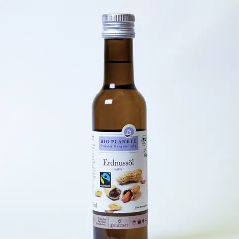 Erdnussöl nativ - gesunde Alternative zu herkömmlichen festen Bratfetten. Kaltgepresstes Bio-Erdnussöl mit Fairtrade-Siegel.Für das native Erdnussöl aus fairem Handel verwenden wir ausschließlich Erdnüsse von ausgewählten Landwirten aus China. Dank des Fairtrade-Projekts von BIO PLANÈTE können wir sicherstellen, dass Kleinbauern vor Ort moderne Ausrüstung, einen Zugang zu landwirtschaftlichem Wissen und faire Preise für ihre Erdnüsse aus ökologischem Anbau erhalten. Diese Form der Partnerschaft ermöglicht Investitionen vor Ort und nachhaltig strukturelle sowie wirtschaftliche Verbesserungen. Das Öl wird zu 100 % aus Fairtrade-zertifizierten Erdnüssen gepresst. Zertifiziert durch die Schweizer Max Havelaar Stiftung können wir unseren Kundinnen und Kunden so ein Fairtrade-Erdnussöl nach höchsten ökologischen und sozialen Standards anbieten.